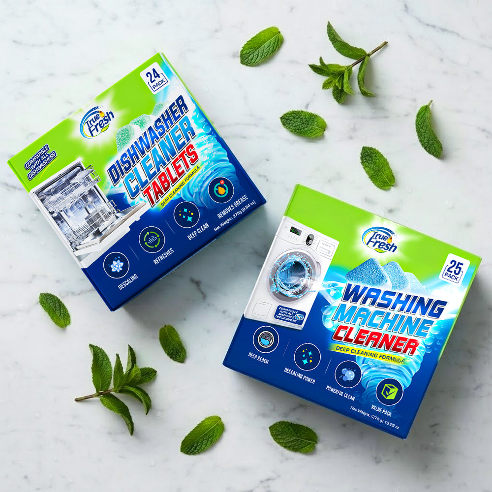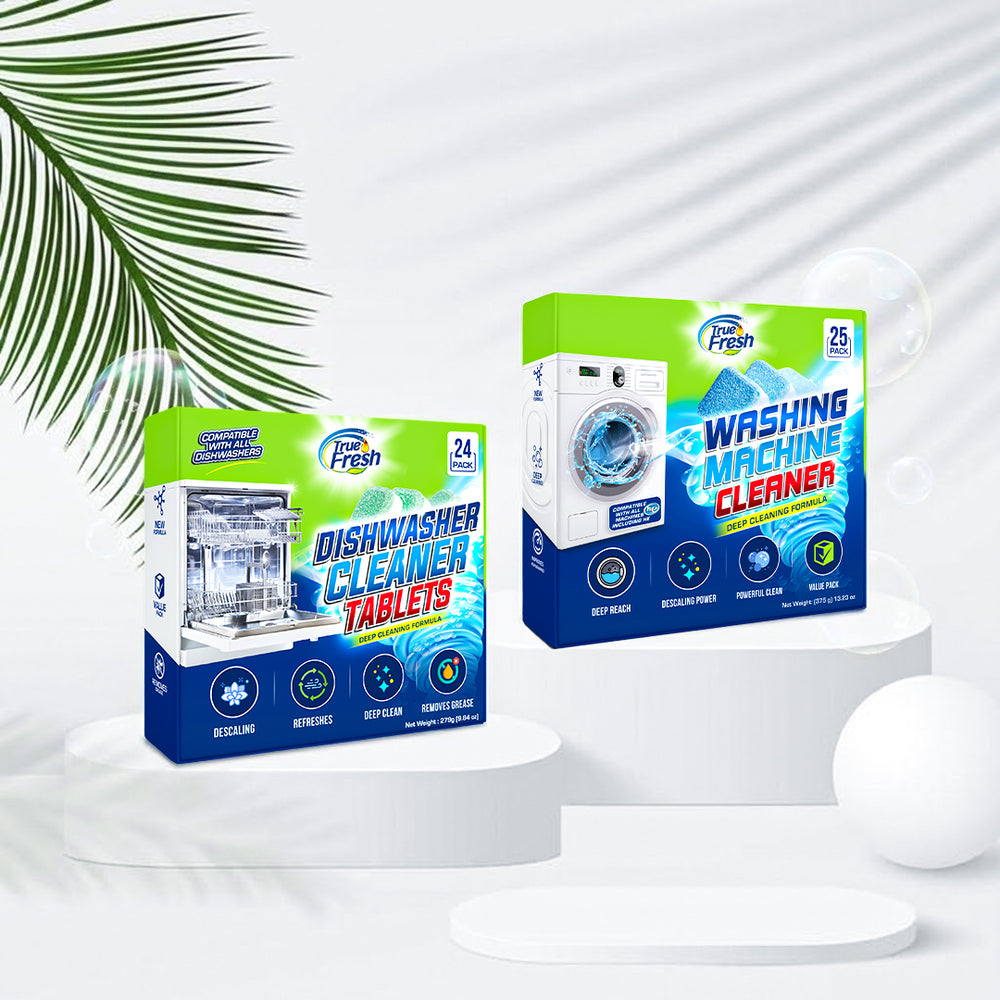 True Fresh Bundle Pack includes 48 cleaning tablets (24 washing machine cleaner tablets + 24 dishwasher cleaner tablets) designed to tackle the toughest grime, mineral deposits, and residues in washing machines and dishwashers. Our powerful formula helps maintain the performance and extend the life of your appliances with minimal effort.